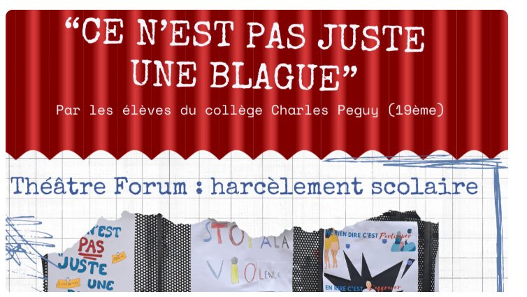Depuis un an, 10 élèves du collège Charles Peguy sont accompagnés par le Centre Clavel pour écrire et mettre en scène ce spectacle sur le harcèlement scolaire. Ce n’est pas juste une blague ! est ainsi un spectacle participatif s’adressant aux jeunes et aux adultes et ayant vocation à sensibiliser aux dangers du harcèlement.