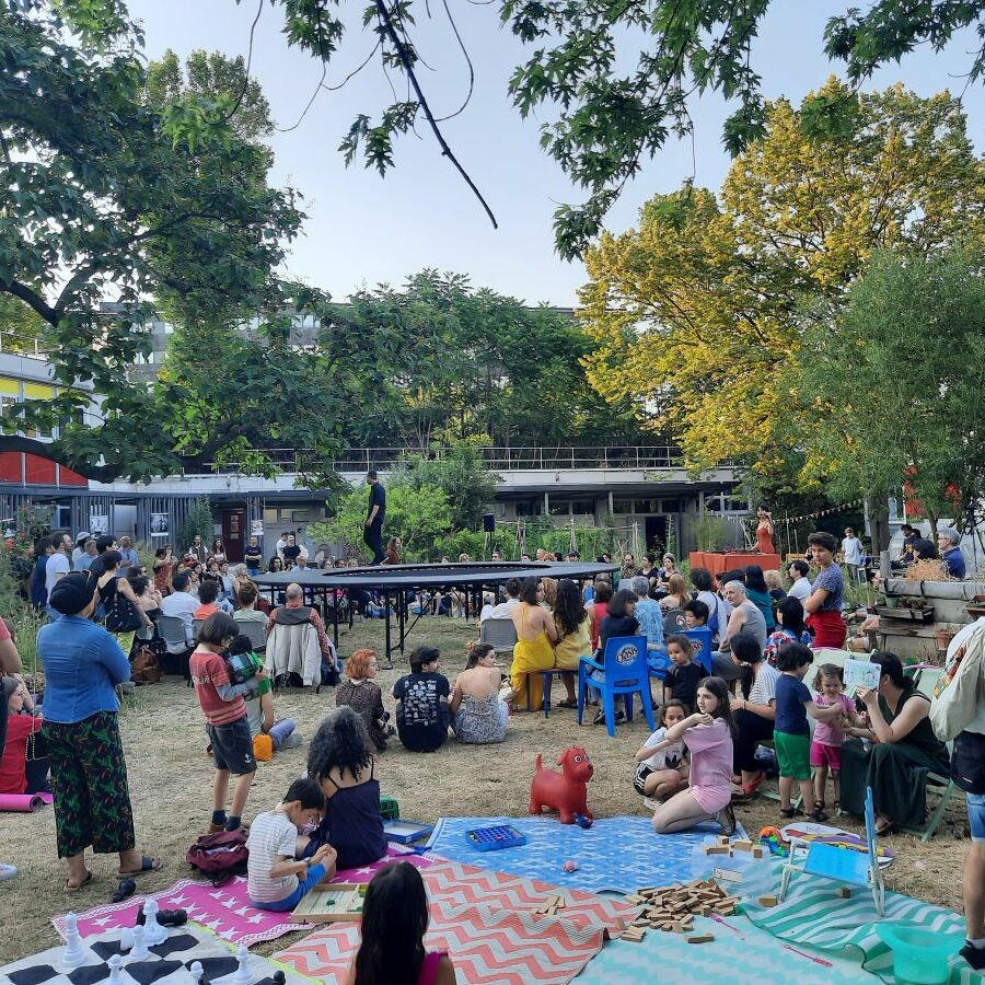 Cette assemblée générale s’est déroulée au Centre Paris Anim’ Poterne des Peupliers, un lieu d’animation, d’apprentissage et de rencontres. Au terme du temps institutionnel, les participant·es ont partagé un temps convivial dans le jardin, paré aux couleurs du Poterne Summer Festival et de l’exposition, Le Jardin de l’engagement, créée par Lise Castillo et constituée de portraits de volontaires en service civique. Un spectacle de trampoline de la jeune compagnie Nevoa, mêlant acrobaties, musique et poésie a clôturé la soirée devant un public nombreux ! Un moment résumant parfaitement nos engagements et la société pour laquelle nous oeuvrons au quotidien !
